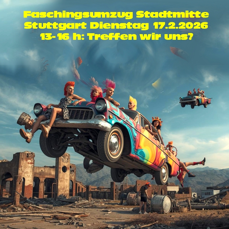 "Jeder Mensch ist ein Künstler" Joseph Beuys Gemeldet sind wir bei den OrganisatorInnen als "Kunstkreis Zuffenhausen" gemeinsam mit einer "Guggenband" und einem Fahrzeug. Unsere Zugnummer wird uns zwei Wochen vorher mitgeteilt und ist hier auf exotistan.de zu finden. Besprechung, Klärung, Ideen-Sammlung: Zehntscheuer Zuffenhausen Samstag 6.12. 15-18 h "Kunst im Karneval" Hymne: "Aufbruch nach Exotistan" Hey: Um uns herrscht Faschings-Treiben Sei es denn: Wir handeln und "verkleiden" uns als KünstlerInnen |